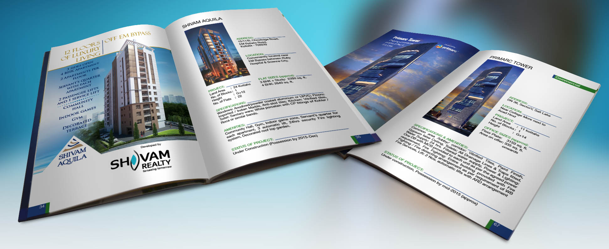 The 80 page booklet with paperback binding included 37 projects from many well-known developers in Kolkata and nearby locations. We delivered the entire planning, design of spreads maintaining respective brand identity of developers and offset printing of around 5000 copies - within a couple of week. We consider this assignment as calibre test of our capable teamwork, execution management and ability to apply accurate printing techniques to reach the target.